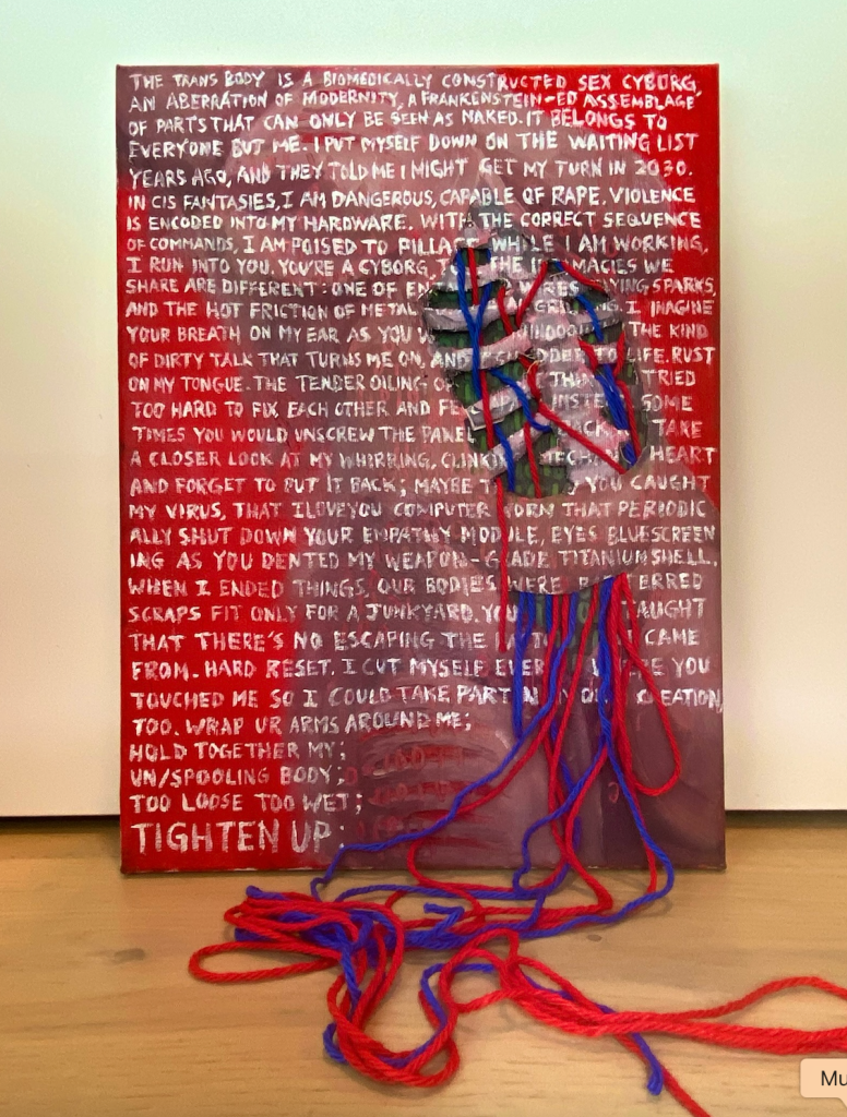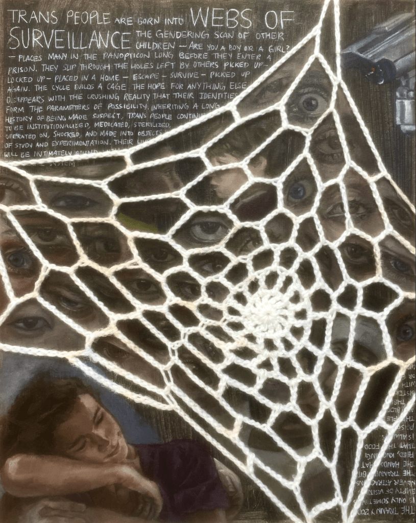 Water-based oil paint depicts eyes, most of which gaze directly at the viewer, emitting a feeling of being "watched." the viewer may, however, feel a sense of security because they are trapped behind a physical crochet web. the kids conversing represent the "gendering scan of other children" and the woman at the bottom, being caressed by an unknown hand, sheds a glimmer of hope for trans intimacy despite the gratuitous violence we face.