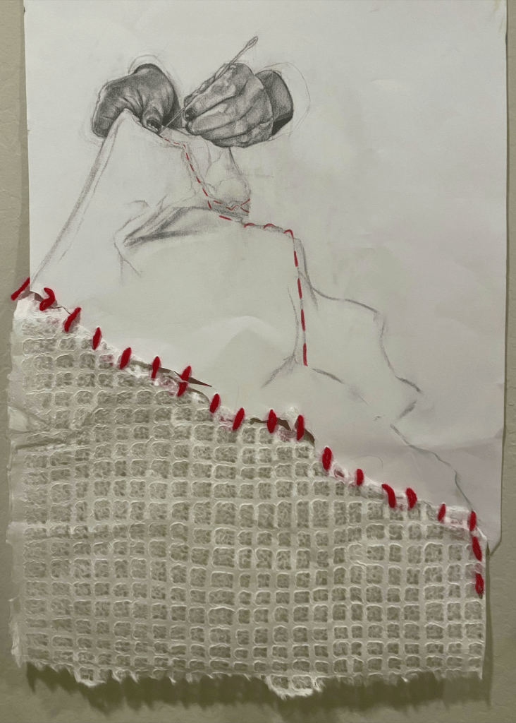 A Network of Care reflects the beginning of my journey in chasing gender-affirming care and how my transgender friends came together to care for me. Because of my chest dysphoria, I desired a binder; however, access was difficult due to my transphobic family. One of my transgender friends gifted me his old binder, but it was ripped at the seams from wear-and-tear. Another trans friend, who is talented in sewing, was able to patch it up for me: an act that this piece illustrates through both the graphite drawing of a set of hands sewing and the red yarn---needle still attached at the end---threaded through the two pieces of paper, resembling stitches. The flowing, never-ending, blurred fabric of the binder represents the fluidity of transness, and the red lines drawn in colored pencil mirror the road that I took in my journey. Additionally, the net-like texture of the bottom piece of paper symbolizes this network of care and the way that my community acts as a safety net for me.