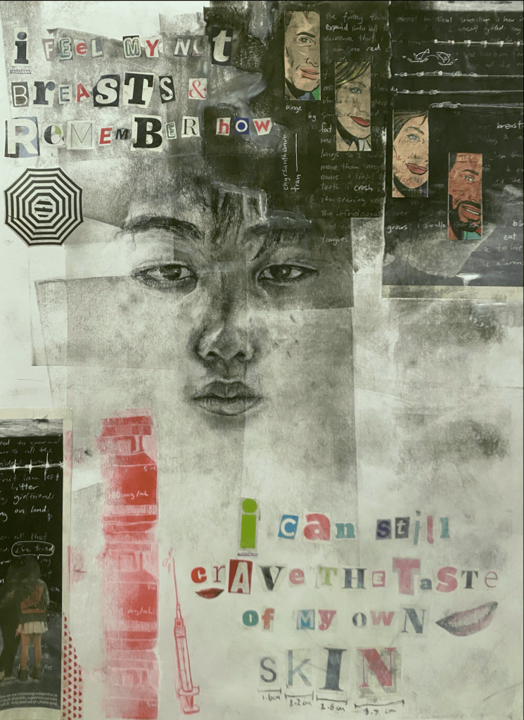 Binge is inspired by a poem of the same name, written by transgender poet Chrysanthemum Tran. Excerpts of her poem are scribbled in white onto the dark corners of the piece, fading in and out with a few points of intensity, as well as the almost imperceptible space between the vials of testosterone---rolled onto the paper with printmaking methods and carved out with colored pencil---and collage. The words "I grow" is smudged away on the right hand side. The final sentence of her poem is cut out of magazines letter-by-letter and brackets a self-portrait of myself, layered with geometric shapes. Additional details include the red lipstick on each character and lane ropes crafted through thin strings, knotted on the left to form buoys. I wanted this piece to be visually interesting and to challenge myself with using as many mediums as possible; my ultimate goal was for the viewer to linger, to spend time searching for all of the small details that can only be uncovered with close observation. The complexity, discordance, and chaos reflect my experience with gender as a transgender teenager.