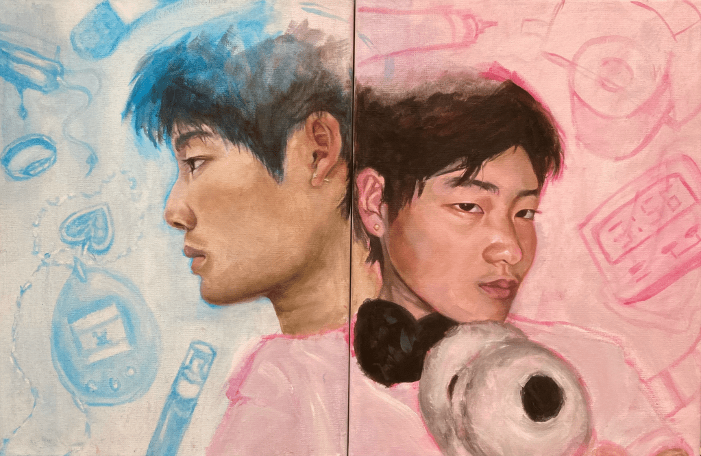 Gender Reveal Party is a water-based oil painting and a self-portrait, strewn across two canvases. It explores my personal relationship with my gender as a transgender person by undermining the stereotypical, gender-aligning pink and blue backgrounds with unconventional objects. I ask the question: why must gender be represented by a dress or a tie? Why can't my gender be linked to objects that feel affirming to me and give me joy? Through various floating possessions---a masculine perfume, which inspires my confidence; my stopwatch, used when I debate competitively through a transgender lens; the binder and tape that help me feel comfortable in my own body---I illustrate my own unique transness.