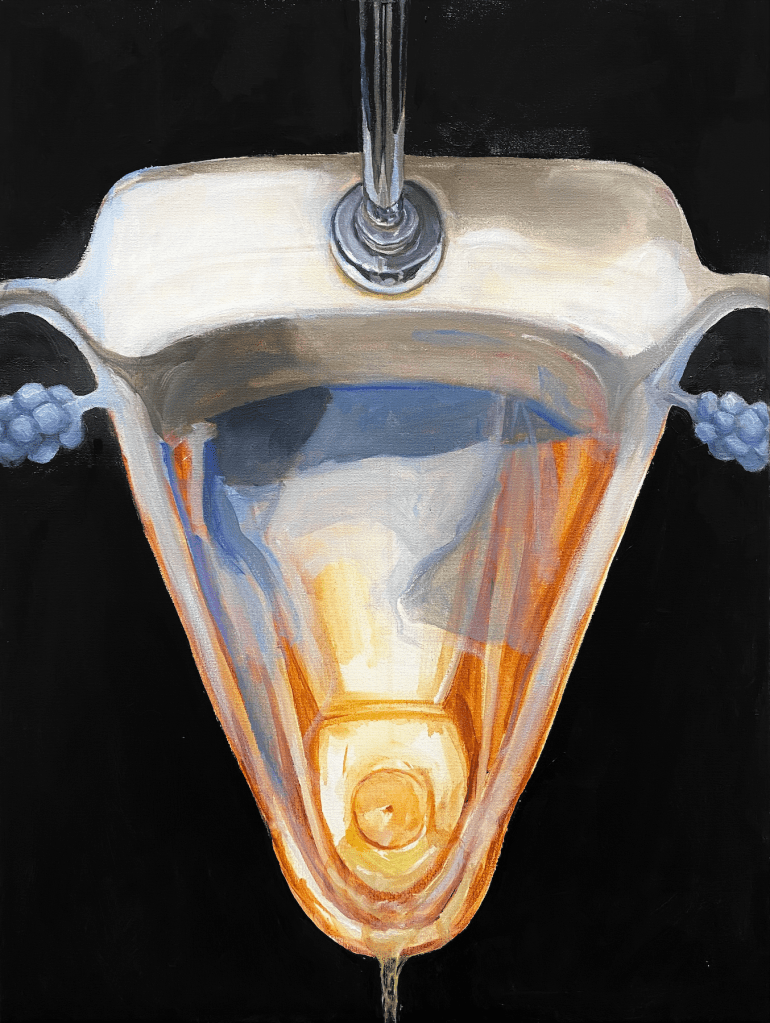 Sites of Bodily Disposal is a water-based oil painting of a urinal that also resembles the female reproductive system, with fallopian tubes and ovaries blending into the porcelain structure. A vivid blue gradually envelopes the raw underpainting of the urinal, and a trickle of urine leaks out the bottom, where it has pooled up. This painting is a commentary on feminine bodily autonomy, as well as the sexism and gendered violence experienced by women around the world.